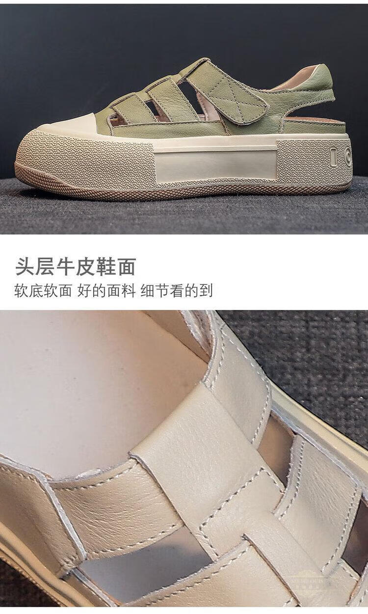 商品名称:奢驰路易(SECHILOUIS)包头凉鞋女2023夏季新款皮复古罗马鞋透气镂空洞洞休闲板鞋女 绿色 36